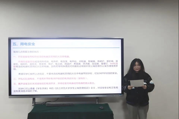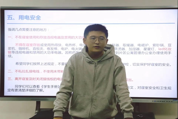最后,徐之砚细致介绍寝室扣分细则并着重讲解寝室用电安全方面的条例,包括禁用违规电器、禁止私拉乱接电线、离寝及时断电等内容。