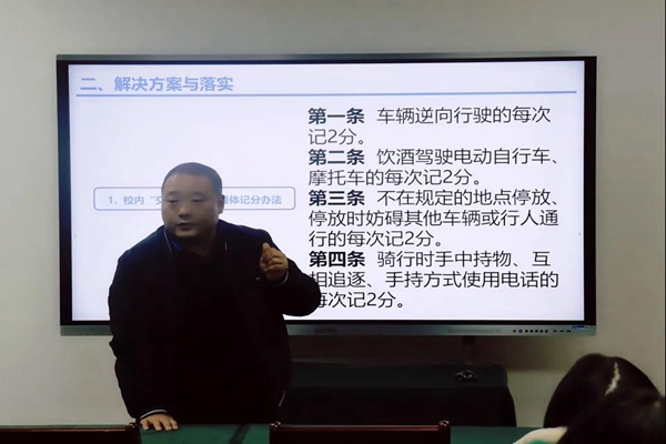 会议伊始,段洪斌老师指出校园中存在的电动车摆放无序、充电与停车资源严重不足等问题和骑行使用手机、非法带人等交通乱象,阐明实行校内“交规化”管理的必要性。为了能够更有效地推动落实该项规定,他详细地阐述了“交规化”的具体管理计分规则。同时,他向同学们介绍了“交规化”管理软件功能,通过该软件,同学们可以查询自己的违章行为和扣分情况。最后,段老师向同学们展示了线上完成电动车信息登记和申领车辆通行证的步骤。