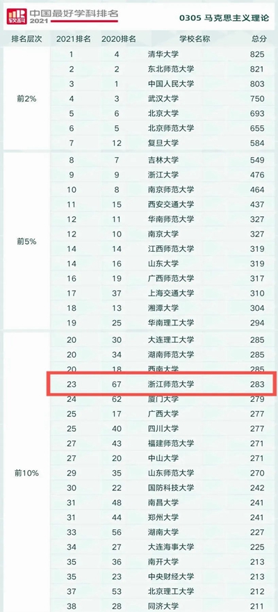 近日,高等教育评价专业机构软科正式发布“2021软科中国最好学科排名”。排名榜单包括96个一级学科,各个学科排名的对象是在该一级学科设有学术型研究生学位授权点的所有高校,发布的是在该学科排名前50%的高校。在马克思主义理论学科排名中,浙江师范大学位列中国一流学科前10%。