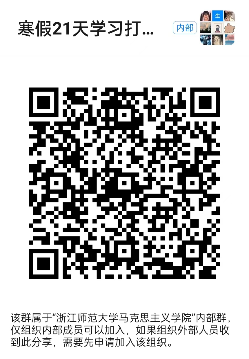 为丰富我院学子假期生活,强化师范技能和综合素质能力,培养自律自强、积极进取的良好学风,浙江师范大学马克思主义学院特此开展“共学共勉,笃行致远”——马克思主义学院寒假21天学习打卡挑战活动。