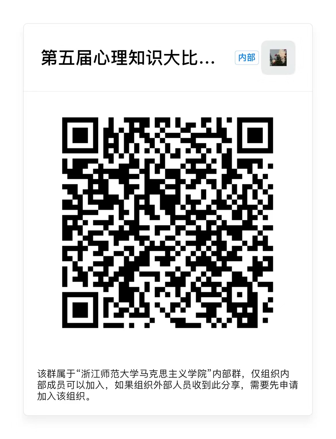 请有意向报名的同学及时扫码下方二维码进入“第五届心理知识大比拼初赛”钉钉群,进群填写“马克思主义学院第五届心理知识大比拼报名表单”后视为报名,表单收集截止时间为3月4日22:00。
