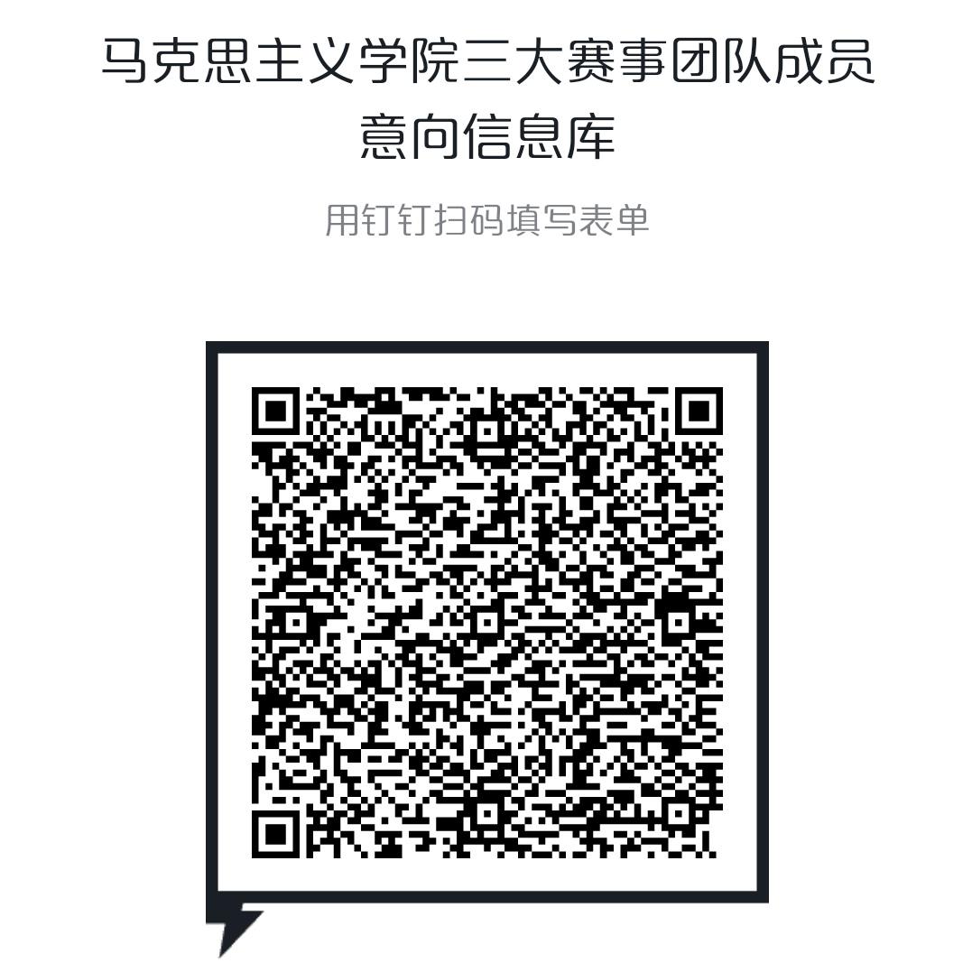 请有意向参加创新创业竞赛的同学于3月19日(本周日)17:00前扫描下方二维码填写“马克思主义学院创新创业竞赛团队成员信息库”表单,其中信息包括基本个人信息、意向分工模块(负责人、文本、美工、视频、答辩)、相关履历等,成功提交表单的同学后续将进入“马克思主义学院三大赛事团队成员信息库”钉钉群。