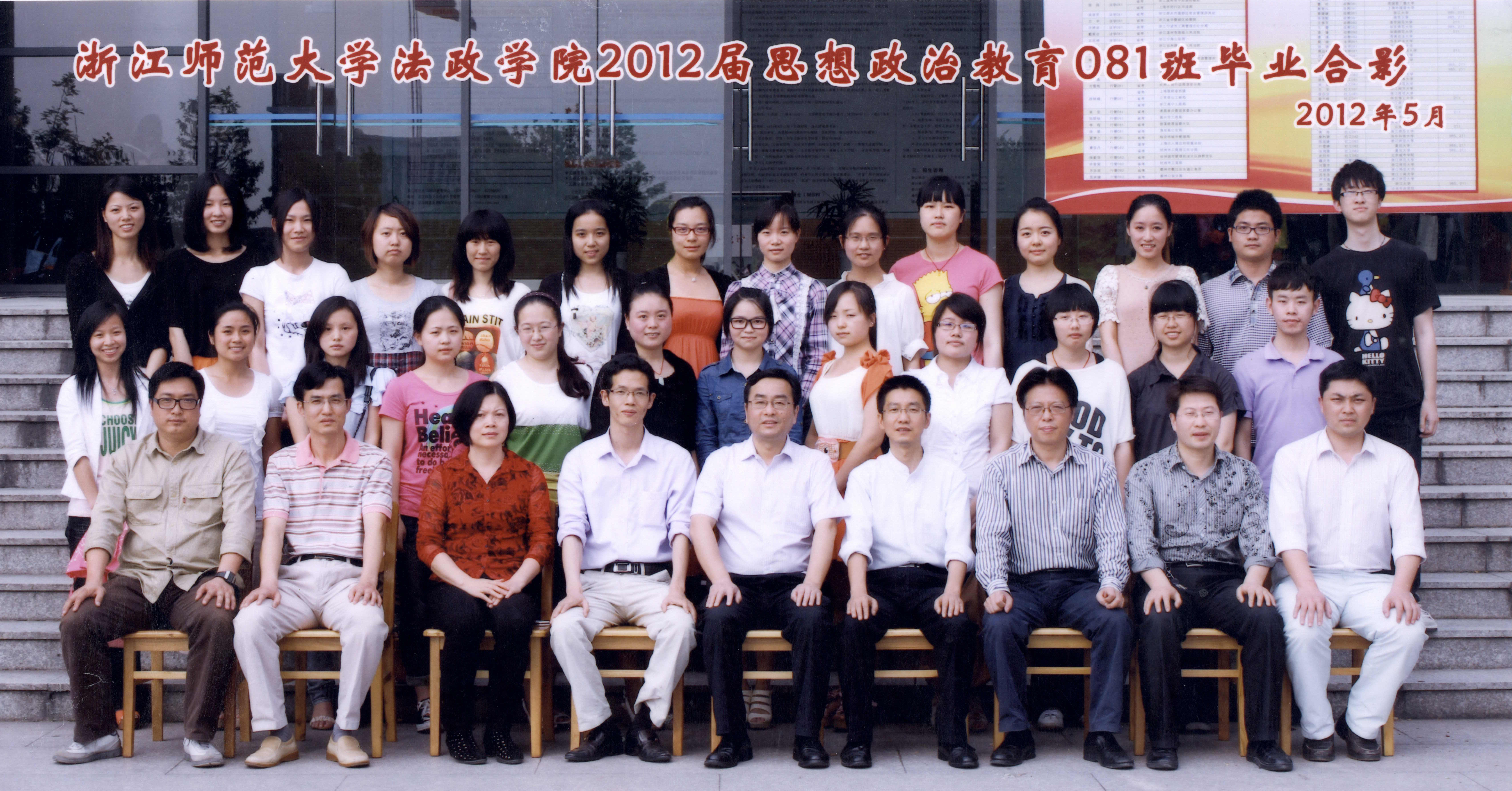 2008 | 政教081班 | 2012 | 蔡楚泓 盖叶勤 王 娜 俞春霞 朱羽洁 查美兰 何 芳 夏晓燕 曾媛媛 陈海懿 陈 姣 李东玲 徐婧超 张思慧 胡俊杰 陈倩倩 林 薇 徐 婷 赵楚楚 应仙环 丁丽娜 潘紫瑜 杨玲凤 周梦迪 陈 琰 董 屹 陶 敏 余 娟 朱蕾燕 邓晓霞 | |