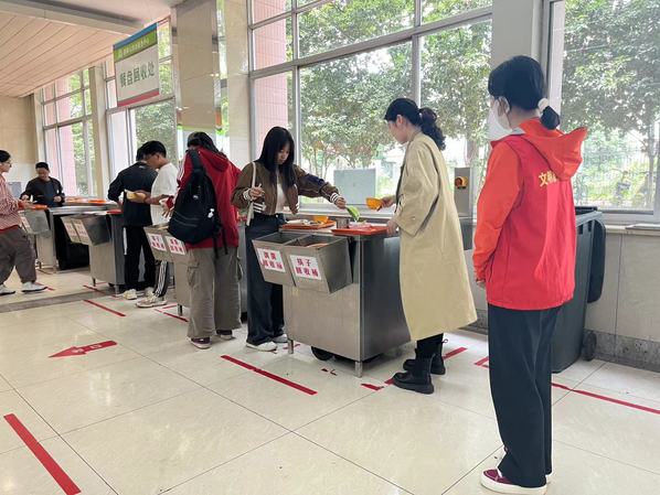 “同学,请按需取餐,切莫浪费粮食哦!”研会成员们披上红马甲、戴上志愿胸牌,足迹遍布校内各大食堂。她们身姿挺拔端正,面带亲切微笑,引导师生有序排队、提醒师生合理取餐、维护餐具回收秩序,在她们的劝导下,食堂整体就餐环境更加和谐,浪费食物现象大大减少,广大师生也对“光盘行动”的活动内容有了进一步的了解。